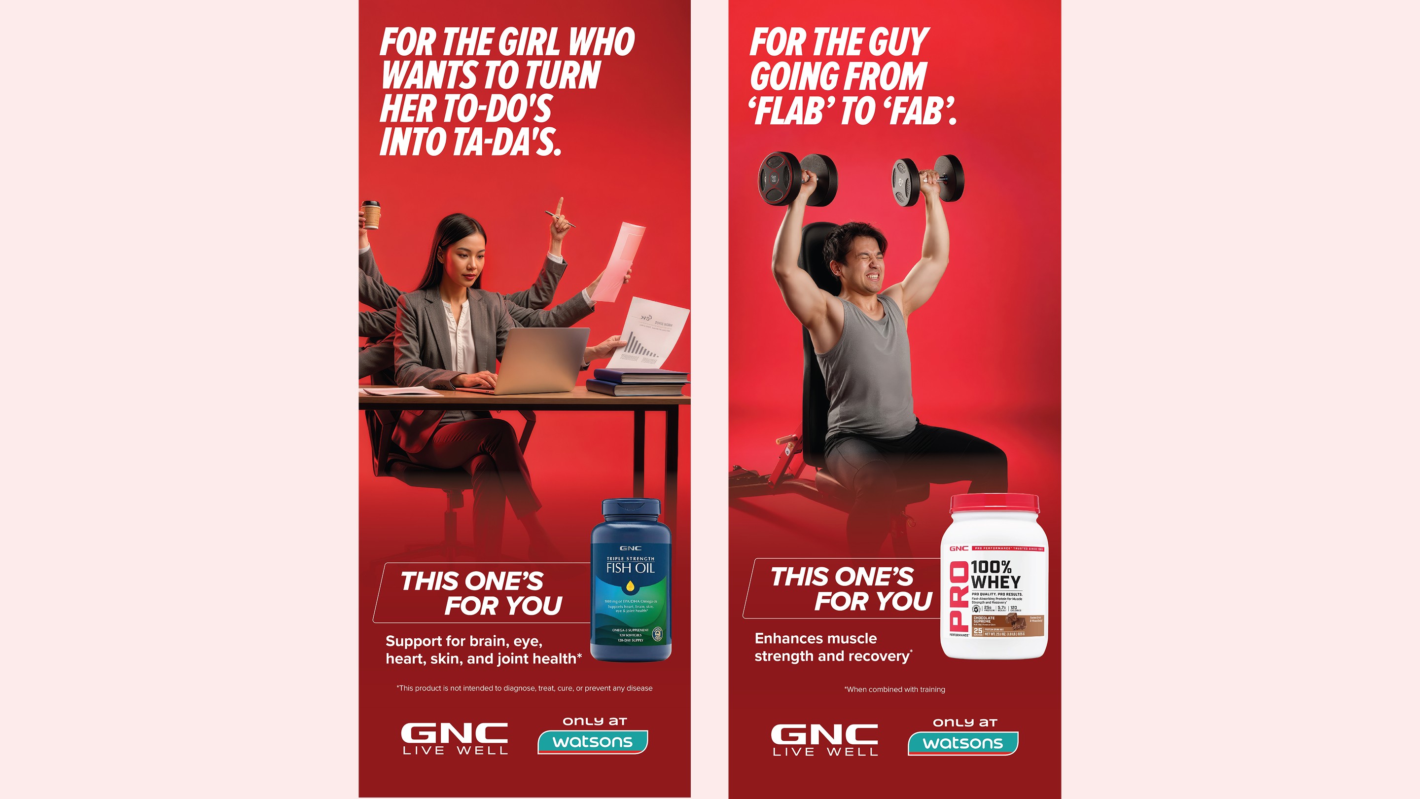 Every healthcare brand talks to the serious athlete. The fitness obsessive who tracks every macro and every rep. But what about everyone else? The ones standing in the supplement aisle, having no idea where to start. Our work for GNC at Watsons spoke to those people - matching real, relatable fitness struggles to the exact products that solve them.