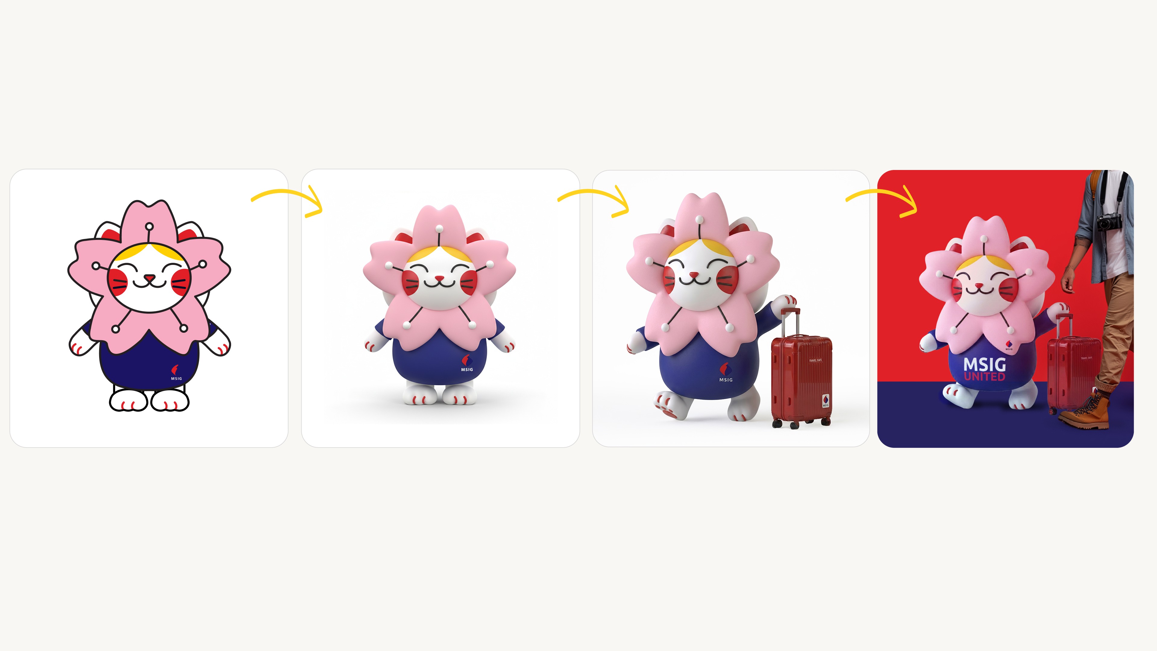 We took MSIG's existing 2D mascot and built an AI generation pipeline that converted Mamori-chan into a consistent 3D render. She was then composited into real-life scenes across every product category. Same character. Infinite scenarios.